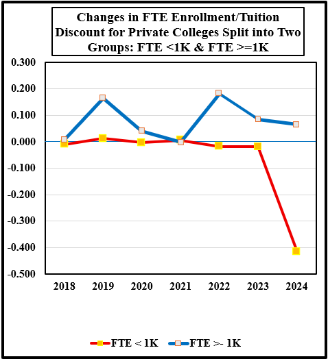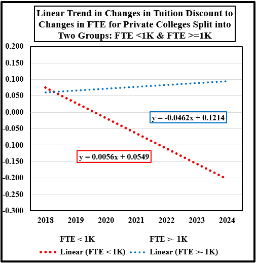 The data set includes 44 private colleges from IPEDS for the period 2017 to 2024 that offered a four-year degree subject to these exclusions because they have different business models: seminaries, yeshivas, art and music schools, research colleges, and colleges with missing data. The last year for the data is 2024; This set of colleges was split into two enrollment groups: FTE < 1,000 students and FTE >= 1,000 students. The data was then averaged for the two groups for each variable by year. The first chart has the basic data trend for both sets of private colleges, and the next two charts show the linear and a second-degree polynomial trend, i.e., a quadratic equation.