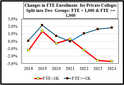 Chart 1 clearly shows that FTE enrollment in the small college group (FTE< 1,000) started to fall in 2016, then took a small jump in the latter stages of the COVID pandemic. After 2021, changes in FTE enrollment for small colleges resumed their steady decline through 2024 with a slight moderation of the rate between 2023 and 2024.