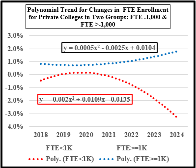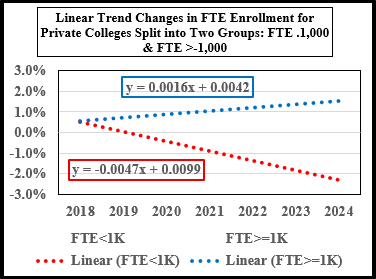 - The data set includes 44 private colleges from IPEDS for the period 2017 to 2024 that offered a four-year degree subject to these exclusions because they have different business models: seminaries, yeshivas, art and music schools, research colleges, and colleges with missing data. The last year for the data is 2024; This set of colleges was split into two enrollment groups: FTE < 1,000 students and FTE >= 1,000 students. The data was then averaged for the two groups for each variable by year. The first chart has the basic data trend for both sets of private colleges, and the next two charts show the linear and a second-degree polynomial trend, i.e., a quadratic equation. ↑