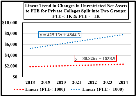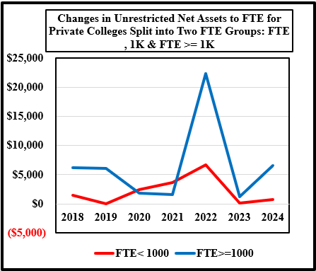 Chart 1 uses a simple ratio to estimate the impact of enrollment on unrestricted net assets: (Unrestricted Net Assets / FTE). The first chart illustrates that enrollment at small colleges is barely providing new funds for unrestricted net assets. In addition, the ratio for large colleges was erratic between 2018 and 2024. The data for both small and large colleges resulted in increases in the ratio in 2022 with large colleges showing a larger jump in the ratio. The bump in 2022 was probably due to the large sums pumped into colleges by the federal government to provide relief from the financial ravages caused by closing of most colleges for a year and transferring their students to on-line programs. The quick and unexpected move to online programs forced college to make large technology purchases.
