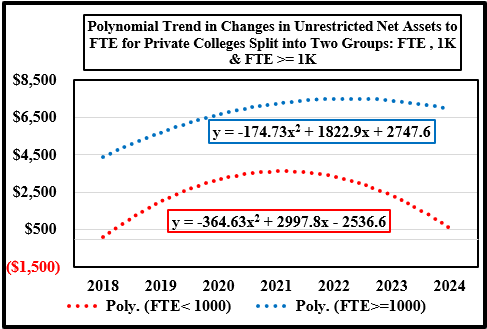 - The data set includes 44 private colleges from IPEDS for the period 2017 to 2024 that offered a four-year degree subject to these exclusions because they have different business models: seminaries, yeshivas, art and music schools, research colleges, and colleges with missing data. The last year for the data is 2024; This set of colleges was split into two enrollment groups: FTE < 1,000 students and FTE >= 1,000 students. The data was then averaged for the two groups for each variable by year. The first chart has the basic data trend for both sets of private colleges, and the next two charts show the linear and a second-degree polynomial trend, i.e., a quadratic equation. ↑