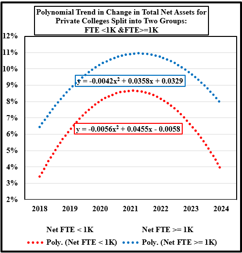 Chart 1 displays the change in total net assets between 2018 and 2024.[1] This chart indicates that the six year period was a bumpy ride for small and large colleges. Total assets took their biggest hit in 2023, when the change in these assets took a big drop from large positive change in 2022 to a negative change. As was noted in the discussion on unrestricted net assets in Slender Thread – 3, the large influx of federal funds from COVID loans into unrestricted net assets carried over to total net assets. Then in 2023, the federal spigot closed, and the change in total net assets for small and large colleges dropped like a rock. The change in small college total assets slipped into negative change territory, while large colleges came within kissing distance of the zero-percentage line. In 2024, the change in total net assets bounced positive with small colleges reporting a greater change than did large colleges. Of course, the question remains – was the upward tick in 2024 indicative of long-term change in total net assets or was the change more like the up-down cycle between movements in 2019 and 2023 or the change could have been due to larger investment returns. In other words, will private colleges after 2024 return to the bumpy ride in total net assets that proceeded 2022? Charts 2 and 3 address long-term trends by using a linear and a second order polynomial to smooth the bumpy ride depicted in Chart 1.