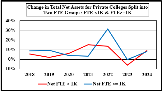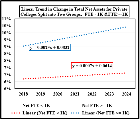 - The data set includes 44 private colleges from IPEDS for the period 2017 to 2024 that offered a four-year degree subject to these exclusions because they have different business models: seminaries, yeshivas, art and music schools, research colleges, and colleges with missing data. The last year for the data is 2024; This set of colleges was split into two enrollment groups: FTE < 1,000 students and FTE >= 1,000 students. The data was then averaged for the two groups for each variable by year. The first chart has the basic data trend for both sets of private colleges, and the next two charts show the linear and a second-degree polynomial trend, i.e., a quadratic equation. ↑